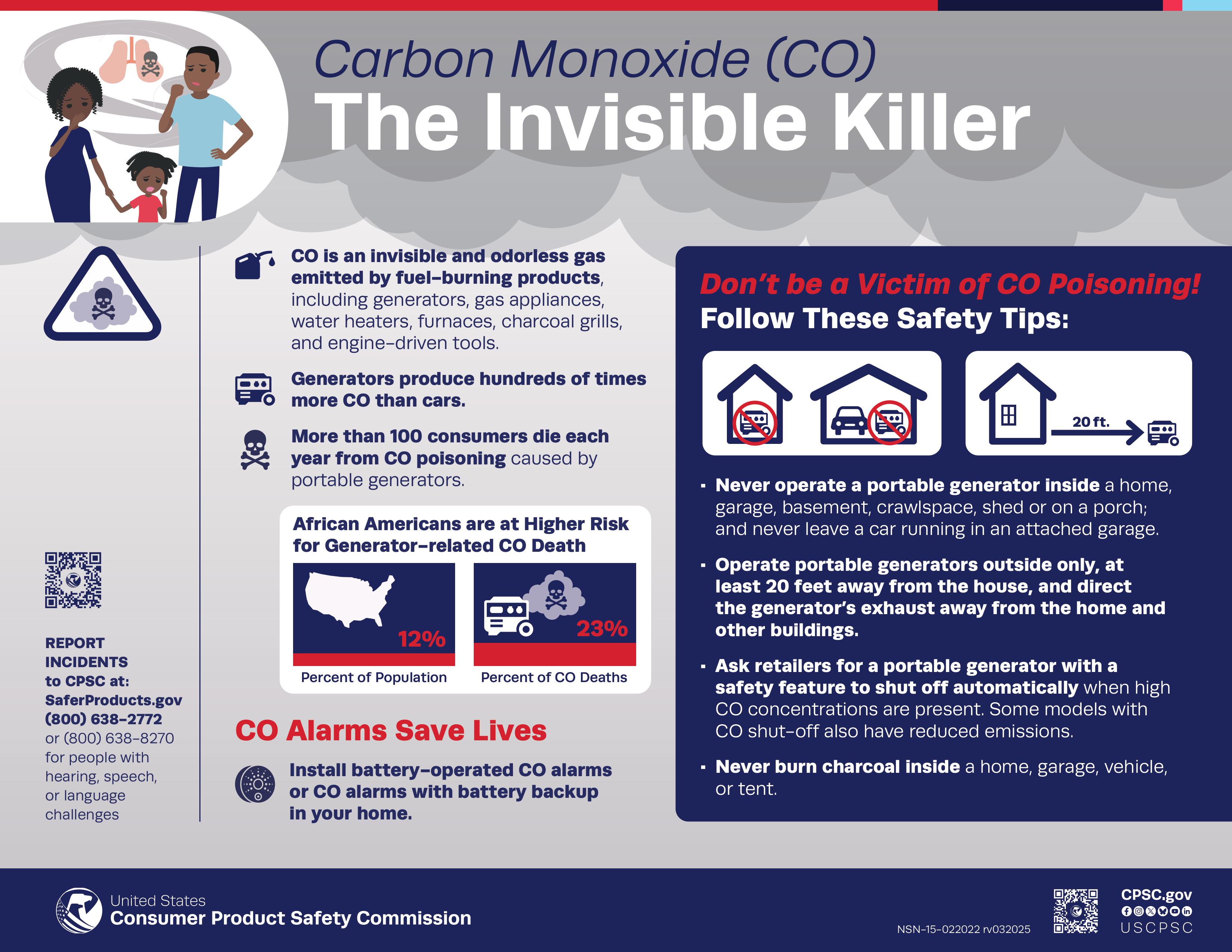 Carbon monoxide, also known as CO, is called the "Invisible Killer" because it's a colorless, odorless, poisonous gas. More than 200 people in the United States die every year from accidental non-fire related CO poisoning associated with consumer products. More than 100 of those deaths are linked to portable generators. Many Americans own portable generators to keep the power on after a storm. However, many people don't realize that one portable generator can produce the same amount of carbon monoxide as hundreds of cars.