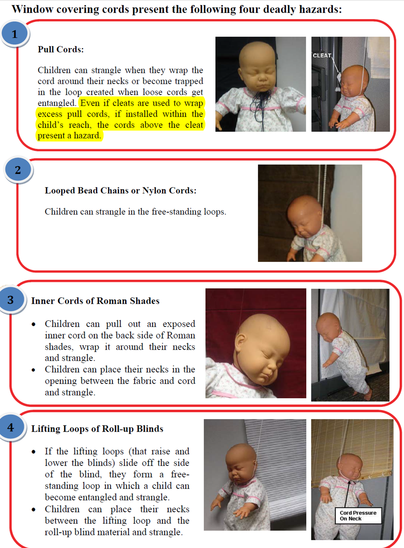 Cordless window coverings are the only option to eliminate the strangulation hazard. If you are unable to replace existing window coverings with cordless ones, CPSC recommends following the steps below. Keep in mind that these steps will not eliminate the hazard; they will only reduce it.