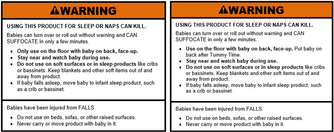Infant support cushions must permanently bear either of the following warning labels, depending on whether or not the product has a tummy time feature: