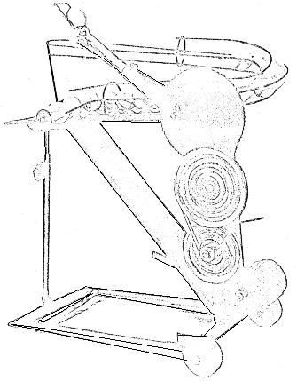 The pitching machines have rotary pitching arms propelled by a gasoline engine or electric motor which powers a gear, pulley and tension spring mechanism.