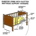 The cribs can be identified by the name "Questor" on a stick-on-label underneath the mattress on the headboard or footboard of the crib. The cribs can also be identified by the slotted hangers and a tubular mattress support.