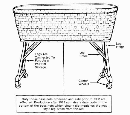 The bassinets are wicker in style and the mattress pads may contain the name Badger Basket on the tag which says "Do Not Remove Under Penalty of Law". Only those bassinets produced and sold prior to 1982 are affected. Satisfactory design changes were implemented by the firm in 1982. Additionally, production after 1983 contains a date code (indicating the month, day, and year of production) on the bottom of the bassinets which clearly distinguish the new-style leg brace from the old (See drawings below).