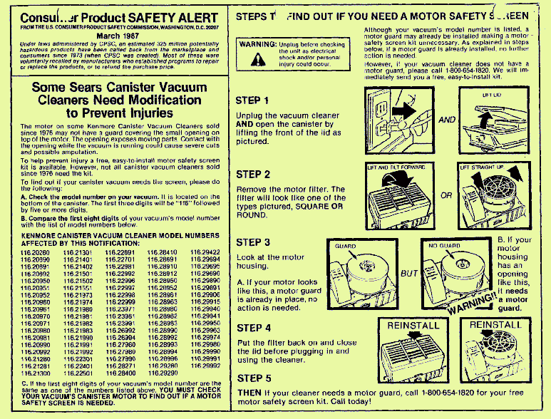 An easy-to-install, stick-on motor safety screen kit which covers the opening on top of the motor is being provided free of charge to owners of affected models. However, not all Sears Kenmore canister vacuum cleaners sold since 1976 need the kit. Whirlpool is informing known purchasers by direct mail. Consumers who bought canister vacuum cleaners at Sears since 1976 can find out if their vacuum motor requires a safety screen and receive additional information by calling 800-654- 1820 toll-free (have the model number from the bottom of the canister ready) or by visiting the customer service counter of the nearest Sears store.