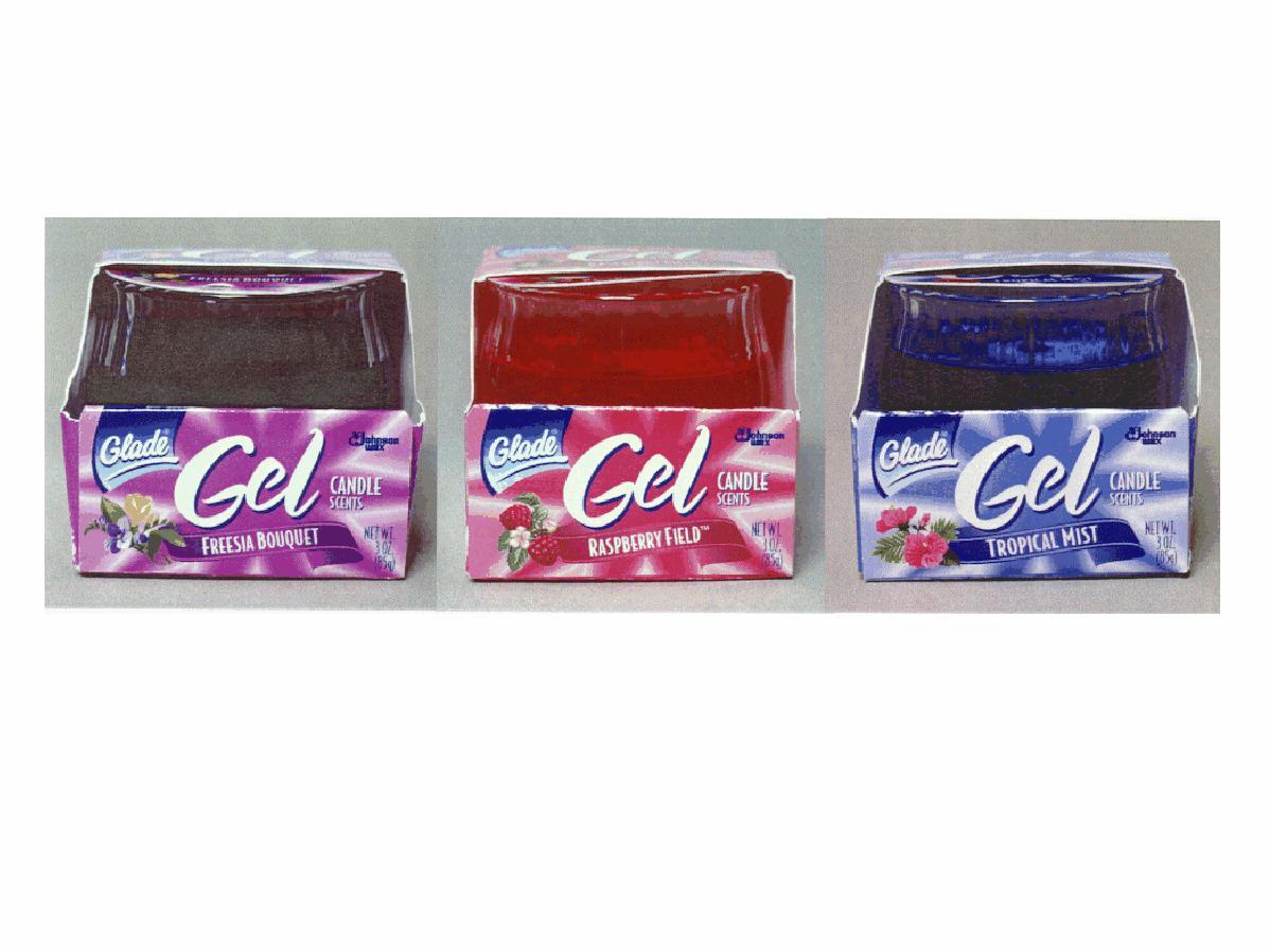 These 3-oz. Gel Candles from Glade have clear, round glass containers about 2 1/2 inches high that contain a scented, hardened gel. The transparent gel candles were sold in three scents and colors: the Raspberry Field-scented gel candles are red, the Freesia Bouquet-scented gel candles are purple and the Tropical Mist-scented gel candles are blue.