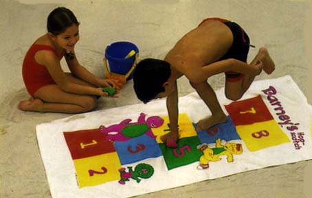 The Barney Hopscotch Game Towel is a terry beach towel with a printed hopscotch board in red, yellow, blue and green. The two beanbags sold with the towels also are made with a terry fabric, one solid green and one solid purple. The beanbags are 2 inches square in size. The towel is 29 inches by 58 inches, and has the Barney, Baby Bop and BJ characters printed on it. The sewn-in label on the towel reads, in part, "Franco Beach Co," and "Made in China." The game towel was sold in a clear plastic bag with white plastic handles.