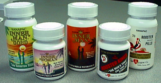 The products involved are "Super Queens Inner Woman", "Super Kings Inner Man", "Sanapac Inner Man Gold", "Sanapac Rooster Brand Pills" and "Extra Strength Rooster Kings". The Sanapac company name and logo are on each bottle. The recalled products are packaged in containers of 30, 35, 60 and 70 tablets, all of which have traditional, screw-on caps.