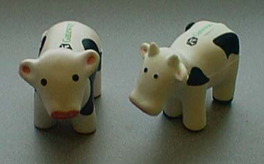 These cows are white with black spots. They are about 4.5 inches long and 3 inches high. "Gateway" is written in green on the cows' backs.