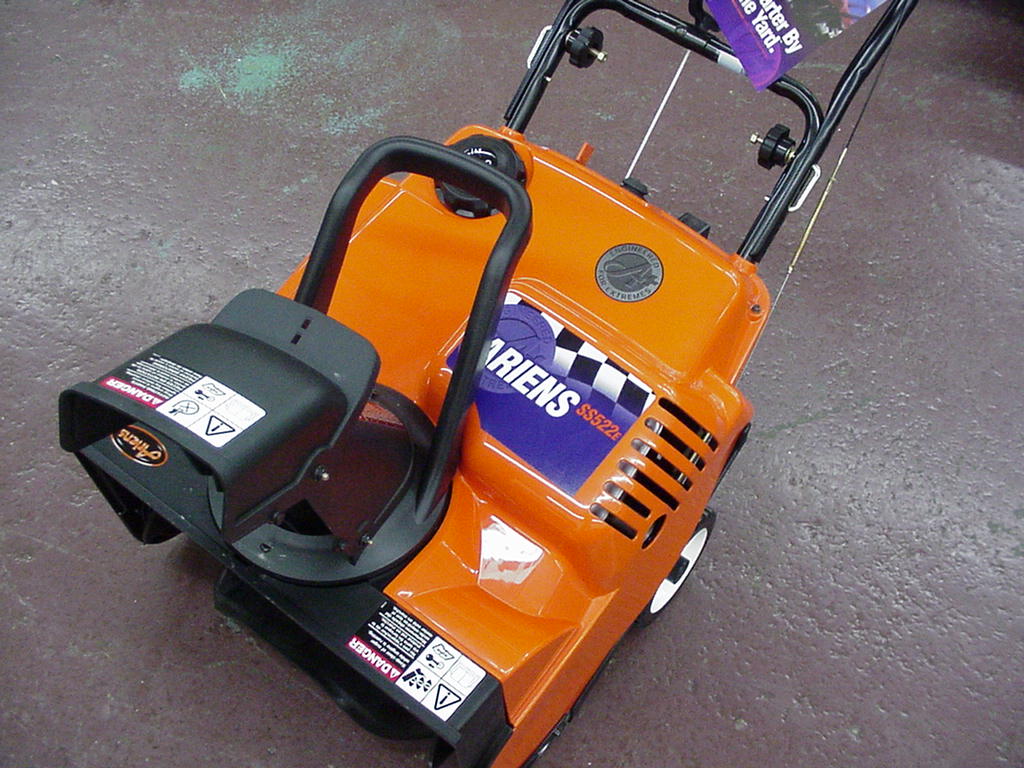 These Ariens snowblowers are orange and have "ARIENS" and "SS322" or "SS522" written on top of the engine cover.