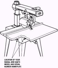 The recalled Craftsman® 8-, 8-, 9- and 10-inch radial arm saws have a model number beginning with 113, usually located on the base of the saw. The brand name "Craftsman®" and store name "Sears" are written on the saws.