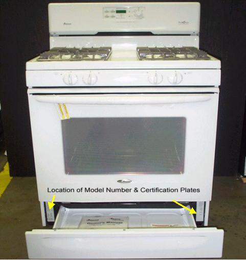 The model and serial numbers can be located by opening the storage drawer and looking at the tag on either the left or the right side. The brand name "Amana" appears on the front of the gas range.