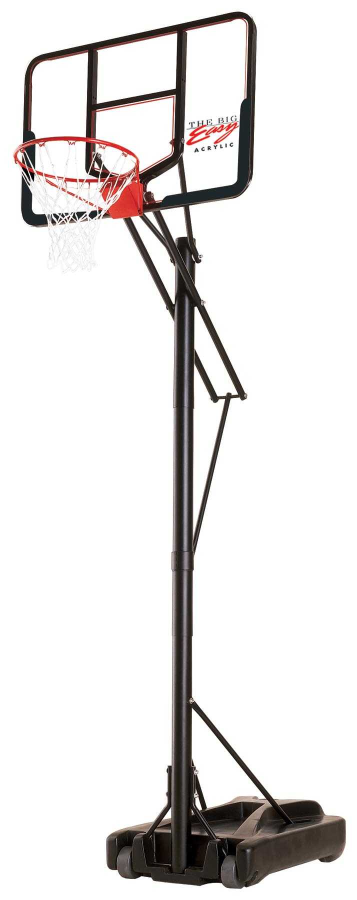 These portable basketball hoops come unassembled with a flat plastic base that is weighted down by either sand or water that is added during assembly. The basketball poles are made of black metal. The brand names or model names may appear on the backboard, main pole or the flat plastic base of the basketball hoops.