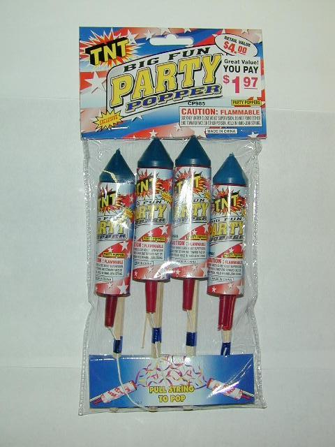 The recalled Party Poppers are packaged in units of four. The Party Poppers were sold in clear cellophane wrappers with blue, yellow and red cardboard headers. The Party Poppers and the packaging are labeled "TNT BIG FUN PARTY POPPER." The Party Poppers are shaped like rockets with 3 ½ inch wooden support sticks.