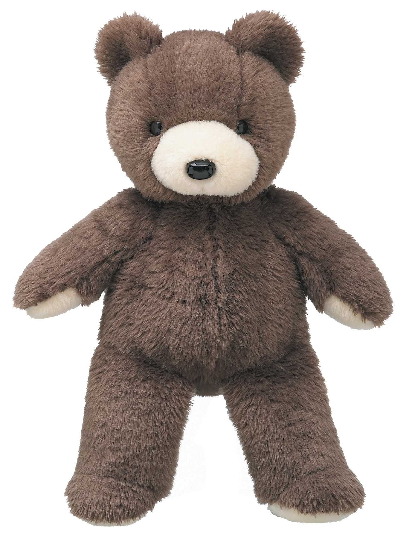 The recall includes the "Founding Bear," and the "Founding Bear II." The "Founding Bear" is about 19 inches long, and the "Founding Bear II" is about 18 inches long. Both stuffed bears are chocolate brown and have cream-colored paws and snout. "OUR FOUNDING BEAR" is written on a cardboard tag that was originally attached to the bear's ear.