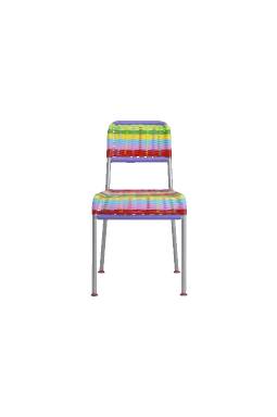Description: Fargglad multi-color children's chairs have the article number 400.548.40 and the supplier number (either 16592 or 17128) on a label on one of the chair's rear legs, or on the underside of the chair seat. The chair has a tubular steel frame with woven multi-color solid plastic piping used for the chair's seat and back. The plastic feet are red.