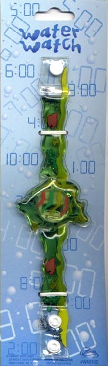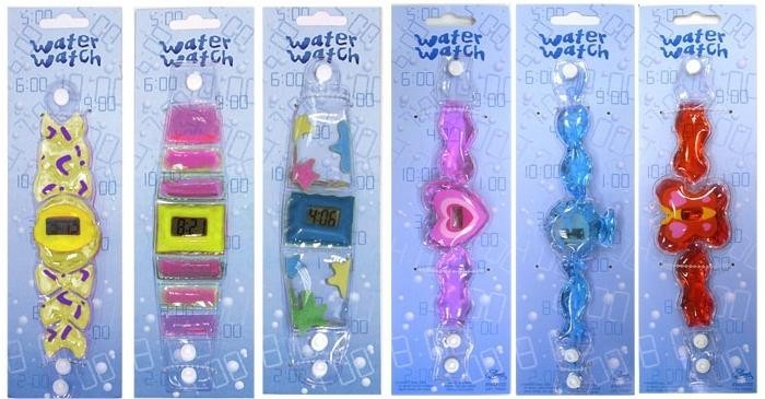 The watches are made of clear plastic with white snaps. The watch bands have clear glitter-filled liquid and colored liquid inside including pink, blue, red and yellow. The watch face is digital and measures about two inches in width. "Water Watch" and "Almar Sales Company" is printed on the original clear bubble packaging of the watches.