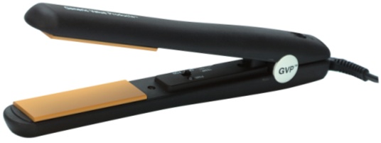 This hair straightening iron has a black housing with golden-colored ceramic heating plates. "Generic Value Products™" is written on the top of the iron and "GVP™" is written in a white circle on the side of the iron. The iron was packaged in a black and white box with the letters GVP™ in large type in the upper left hand front corner. The SKU is 264800, which is written on the packaging.