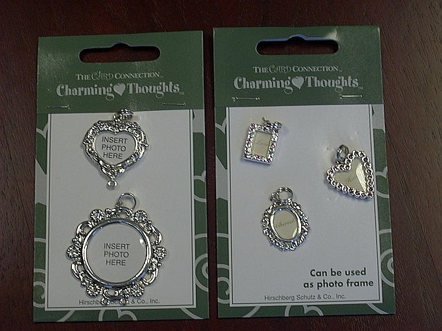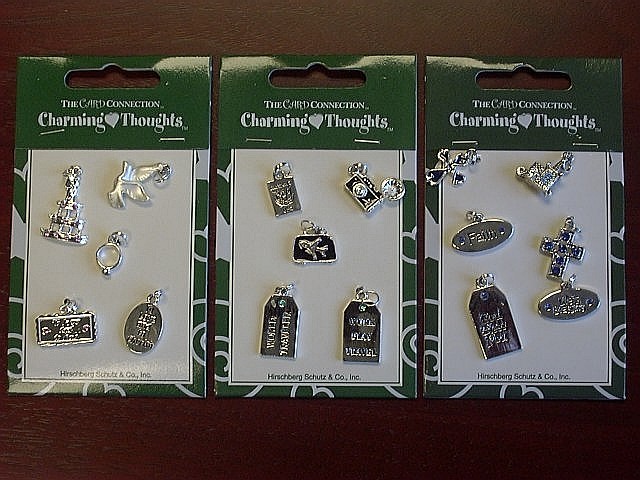 The recalled metal charms were sold under the name "Charming Thoughts™." Most of the charms are silver-colored with small silver loops. They were sold in packages of two to 12 pieces. The packages are marked "The Card Connection™," "Charming Thoughts™" and "Hirschberg Schutz & Co. Inc." The metal charms are various shapes including small hearts, crowns, birds, picture frames, perfume bottles and a cross. Some of the metal charms have small blue, pink or yellow stones and are printed with words including "princess," "congratulations," "city girl," "world traveler" and "life's blessings." "Insert photo here," "cherish," "love," and "honor" are printed on the picture frame charms. The metal charms were sold as decorations for place cards, greeting cards, collages, memory boxes, gift cards, scrapbooks, invitations and gift bags. The charms also can be attached to necklaces and bracelets.