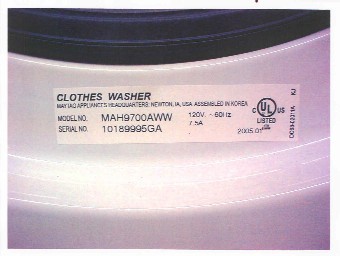 The recall involves white Maytag front-load washers with model number MAH9700 and a serial number from 10188468GA through 11683946GJ. The model and serial numbers are located inside the door opening and below the rubber boot.