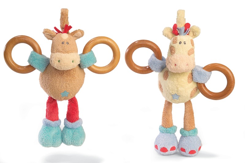 Description: The product is a baby activity toy available in various animal shapes. It consists of a soft, stuffed body with a rattle component inside the body and two smooth wooden rings attached to loops at the end of each arm. The product is available in four different styles: Rumba Lion Activity Toy with style number 58553, Gazoo Giraffe Activity Toy with style number 58554; Wango Horse Activity Toy with style number 58555, and Tippy Cow Activity Toy with style number 58556. "Woodles™" and the style number are located on the sewn-in label.