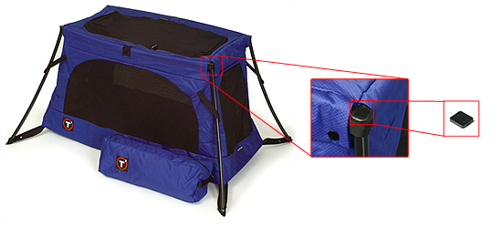 Description: The recalled travel cot consists of an aluminum frame with four legs that holds a fabric enclosure for a small child with mesh windows on all sides and a zippered mesh opening on the top. The cot has big black labels on each long side with a white T in a red circle, as well as phil & teds logos on each short end.
