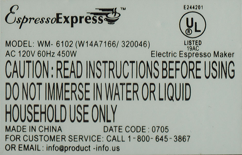 Description: The Espresso Maker has a black base and a silver water reservoir. The coffee carafe is smoke-colored plastic with a back handle. The words "Espresso Express™" are imprinted on the black base. The item number is W14A7166, which is located underneath the base.