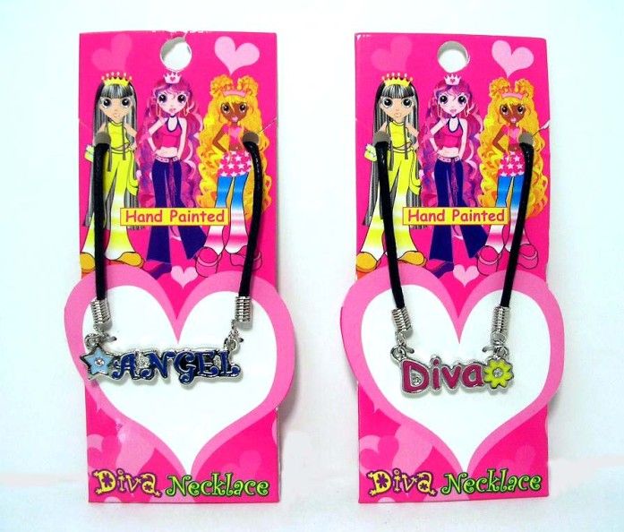 Description: The recalled Mood Necklaces are multi-colored pendants shaped as hearts, moons, shamrocks, spiders, butterflies and lizards that hang from a black chord. The packaging is a black cardboard wrapped in plastic with "Mood Necklace" printed on the front and "Item # JW41001" and "UPC number 898846410011" printed on a sticker on the back. The recalled Diva Necklaces consist of pendants shaped as the words "ANGEL" or "Diva" that hang from a black chord. The packaging is pink cardboard with "Hand Painted" and "Diva Necklace" printed on the front, and "Item # 21800020" and "UPC number 898846200186" printed on the back.