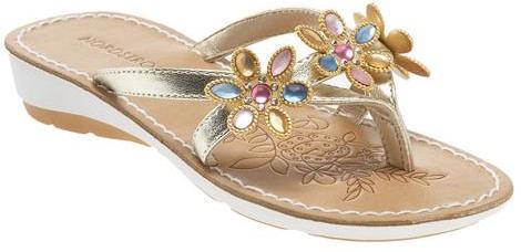 Description: This recall involves Nordstrom brand sandals sold in toddler and little girl's sizes. The Calypso-style shoes are tan and white with gold straps that have three jeweled flowers on the top. "Nordstrom" and a flower pattern are embossed on the upper sole of the shoes. Toddler sizes were sold with an ankle strap.