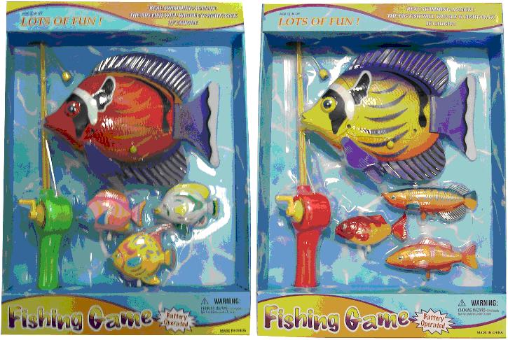 Description: The recalled Fishing Game contains a fishing pole, one large battery operated fish, and three small wind-up fish. The UPC #011546208270 and product #25741 are printed on the product's packaging.