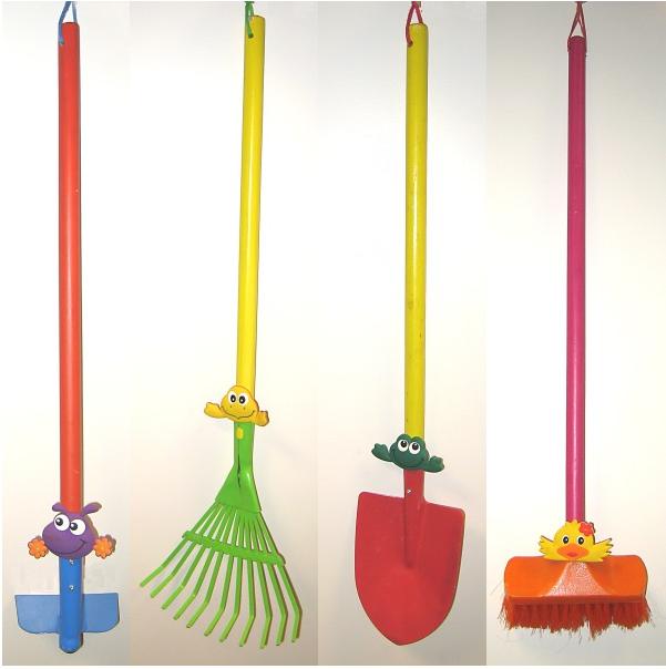 Description: This recall involves the Robbie Ducky children's leaf rake, hoe, broom and spade. "Robbie Ducky™ Garden Collection" is printed on a tag attached to the handle. The rake has a yellow handle with the head of a tortoise and green prongs. The hoe has an orange handle with a caterpillar and a blue blade. The broom has a purple handle with a duck and an orange brush. The spade has a yellow handle with the head of a frog and a red blade. The tools measure between 27 and 29 inches long.