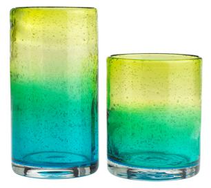 Description: The recalled glassware pieces involve large and small tumblers, goblets and margaritas. The bottom half of the tumblers is aquamarine and the top half is yellow. The bottom of the margaritas and the goblets is clear and the top is aquamarine and yellow.