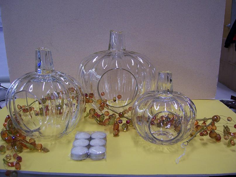 Description: The product is the "Heartfelt 3 Glass Pumpkins with Tealights and Garland by Valerie." It consists of three separate glass candle holders of three graduated sizes which are shaped like pumpkins. Each set includes six tea light candles, as well as a glass bead decorative garland. The pumpkin candle holders were sold in either clear glass or an amber color.