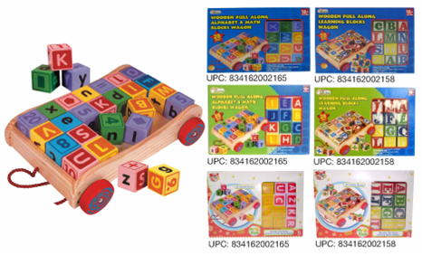 Name of Products: Wooden Pull-Along Alphabet & Math Blocks Wagons, Wooden Pull-Along Learning Blocks Wagons, 10-in-1 Activity Learning Carts, and Flip-Flop Alphabet Blocks