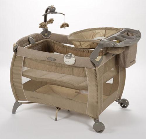 This recall involves Eddie Bauer Soothe & Sway portable play yards. The convertible play yard has a bassinet and changing station feature. A mobile with three teddy bears was also sold with the play yard. Models included in the recall are 05046 (all units) and 05044 units manufactured before December 1, 2008. Different models were sold in Canada. Model numbers and manufacture dates are printed on a sticker on one of the support legs underneath the play yard. Manufacture dates are printed in the YY/MM/DD format.