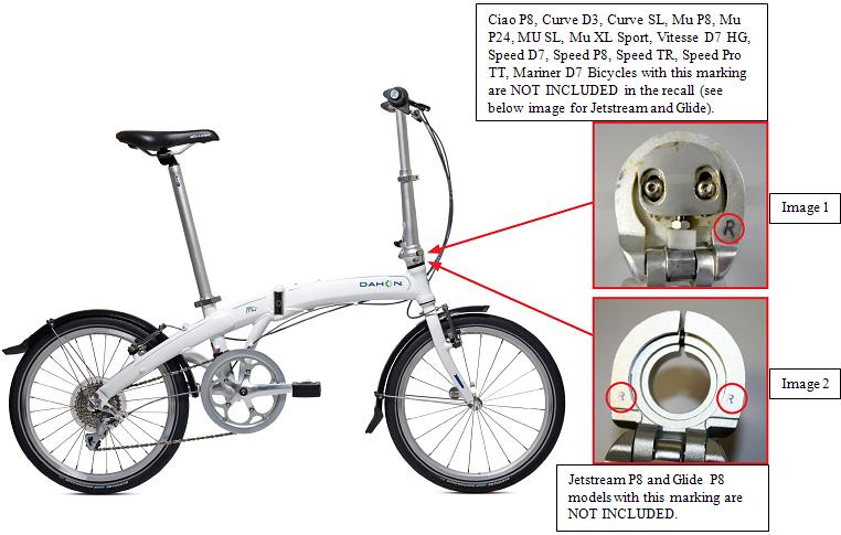 The words "Dahon" or "Novara" and the model name are printed on the bicycle. Except for the Jetstream P8 and Glide P8 models, hinges with an "R" embossed on the face of the upper handlepost hinge and/or a "Radius Handlepost" sticker on the handlepost are not included in the recall. All Jetstream P8 and Glide P8 models are included in the recall unless they have an "R" embossed twice on the face of the of the lower handlepost hinge (Image 2) indicating they have been repaired.