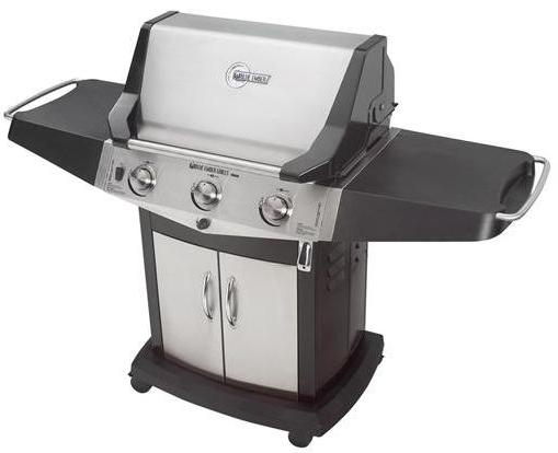 This recall involves Blue Ember liquid propane (LP) outdoor grills with model and serial numbers listed below. The cabinet style grill has two doors and is silver and black or silver and gray. "Blue Ember" is printed on the grill's hood. The model and serial numbers are printed on a rating plate label on the rear of the grill.