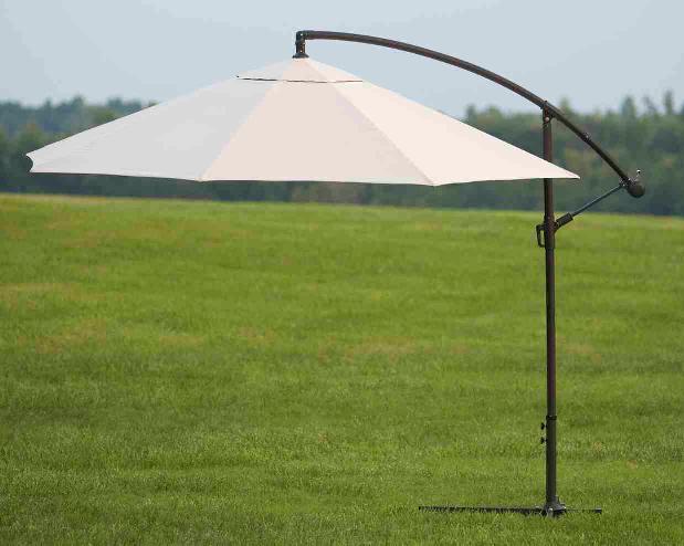 The patio umbrellas are beige with a brown offset pole. They stand 11 feet tall. The base is a brown cross about 18 inches long.