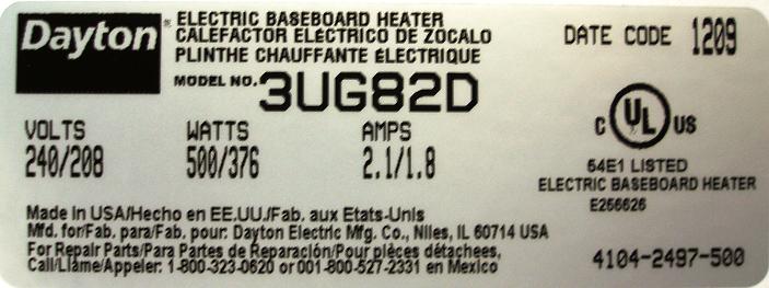 This recall involves Dayton 240/208 volt model 3UG82D electric baseboard heaters. The white, rectangular heaters are 30 inches long by 6 3/4 inches high by 2 7/8 inches deep. A nameplate on the bottom right side of the base has "Dayton Electric Mfg. Co.," model 3UG82D and date code 1209. Only heaters purchased after December 21, 2009 with a date code of "1209" are included in this recall. The recalled heaters have yellow and white wires inside the panel where the heater connects to the power source. Heaters with red and black wire are not included in this recall.