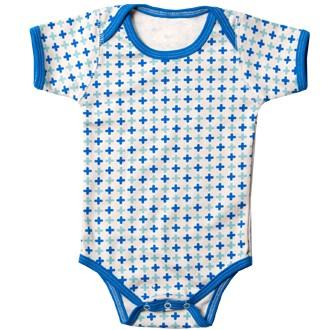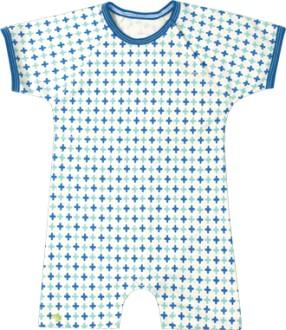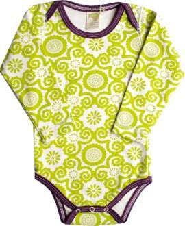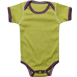 The infant bodysuits and rompers were sold in eight colors and prints: eggplant with kiwi green binding, floral print with eggplant binding, kiwi green with eggplant binding, pacific blue with kiwi green binding, crisscross print and kiwi green with pacific blue binding. The infant bodysuits were sold in sizes 0 to 3 months up to 12 to 18 months. The rompers were sold in sizes 0 to 3 months up to 18 to 24 months. "Kiwi industries" is printed on a tag sewn inside the garment's collar.