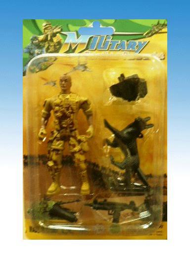 The mini military toy set is packaged on a blister card and includes a male military figure about four inches in height with various accessories.
