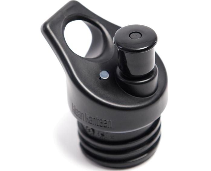 The Sport Cap 2.0 water bottle spouts are made of black plastic and have an attachment loop. "Klean Kanteen" is stamped into the side of the cap.