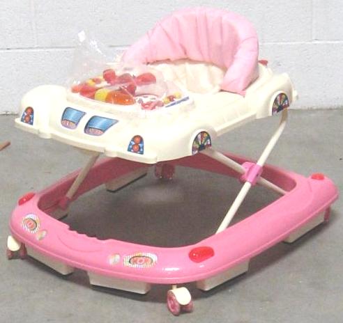 The recalled walkers are intended for babies 6 months and older. The item number L-0809EN is printed on the side of the box. The walkers are blue or pink with a white tray.