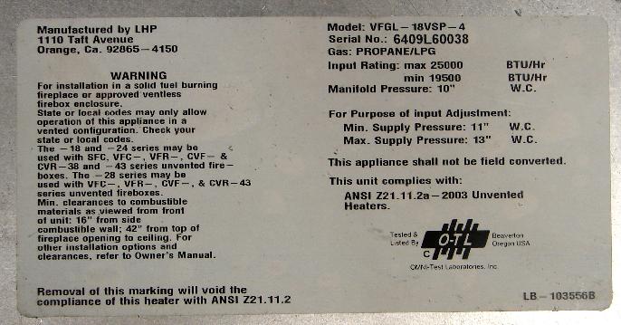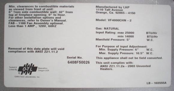 The recalled products are Lennox Superior brand VFGL Log Sets and VF4000, VF5000 and VF6000 fireplaces. Log sets are comprised of ceramic-fiber logs with a dual gas burner system and are designed to be placed in a wood-burning fireplace or a ventless firebox enclosure. Fireplaces are comprised of log sets, a ventless firebox enclosure and accessories. Each product has a metal rating plate attached to the grate of the log sets or to the frame of the fireplaces containing the unit's model number, serial number and other information. The following models are affected by this recall: