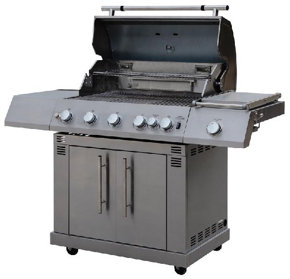 This recall involves Master Forge five-burner, stainless steel gas grills. The name "Master Forge" is on the grill hood. The model number L3218 is located on a label inside the left front door of the grill.