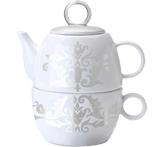 Description: This recall involves the Tea for One "Flourish" design tea pot set, which includes a stackable teapot and cup. The teapot and cup are white ceramic with matching metallic foil decorations on each. The tea cup is marked "Dishwasher and microwave safe" and "Made in China" on the bottom, in English and French.