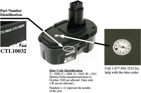 This recall involves RAYOVAC-branded replacement battery packs used with cordless power tools. "RAYOVAC," "NI-CD" and a part number beginning with "CTL" are printed in white lettering on the product. The battery packs were sold in voltages ranging between 2.4 and 18 volts in various sizes and shapes. They were sold as replacement batteries to the following brand tools: Black and Decker, Bosch, DeWalt, Makita, Milwaukee, Panasonic, Ryobi and Skil.