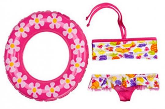 The inner tube is part of the three-piece Fruit Tutu Bikini swimwear set for teddy bears, which includes a two-piece fruit-print bikini. The inner tube is 9 inches in diameter and pink with white and yellow flowers printed on it. The model number of the swimwear set is 017220 and is located on the price sticker on the "Build-A-Bear" cardboard tag.