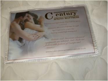 This recall involves Chicago Century Furniture Corp. twin-, full-, queen- and king-size mattresses with the model number "MG006." The mattresses are 3 inches thick with white and off-white fabric with a tone-on-tone swirl pattern. The model number can be found on a paper tag attached to the foot of the mattress. The words "Century Spring Mattress" appear on a fabric label on the topside near the foot of the mattress. A picture of a man and woman embracing also appear on the label.