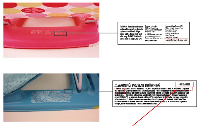 This recall involves Summer Infant baby bathers with a small, nearly square blue or pink plastic base measuring about 13 ? inches long by 12 ? inches wide and with the following model numbers listed below. Model numbers are located either on the side of the baby bather near the warning label or on the front near the wash instructions. Some units have multiple model numbers. Model numbers with an additional letter at the end of the model number are also included in this recall.