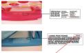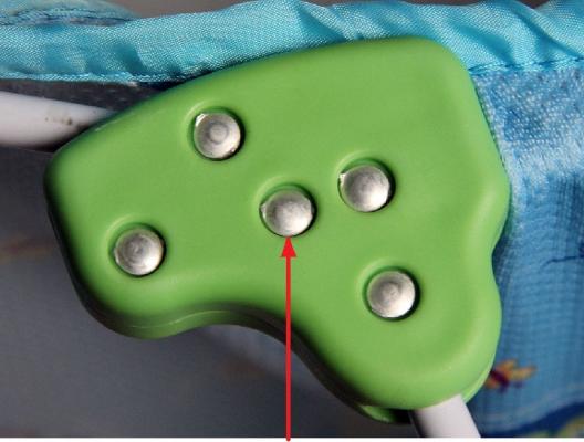 The bathers have adjustable side hinges with five rivets each and a white wire frame with a mesh fabric sling seat and two or three positions for the seats. Some also have a head support cushion. The fabric seat comes in various colors including white, blue, green, yellow and orange with fish, turtles, butterflies, frogs, flowers and duck patterns. Bathers manufactured since July 2007 include the warning "Never lift or carry the bather with infant in it."
