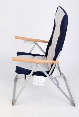 The recalled item is a West Marine Deluxe Deck Chair. It is a folding deck chair with metal legs and light-colored wood armrests. It has plastic feet on the corners of each leg. The seat and back are covered with blue and gray nylon fabric. The back can be adjusted to various angles. Model/SKU number "13110341" is printed on a coated paper tag attached to the chair frame.
